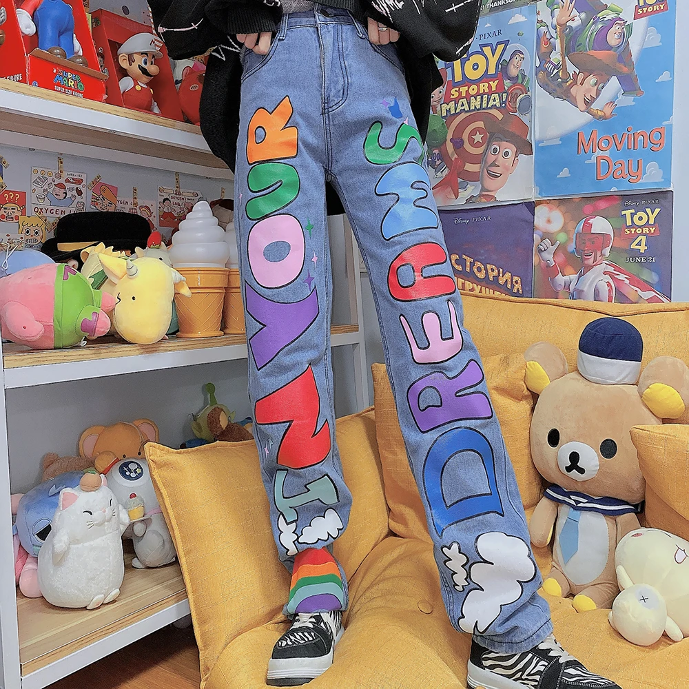Best Women High Waist Jeans Japanese Harajuku Loose L Color Letters Street Straight Pants Sweet High Street Fashion Wide-leg Trousers and You will save 31% or US $29.56 today