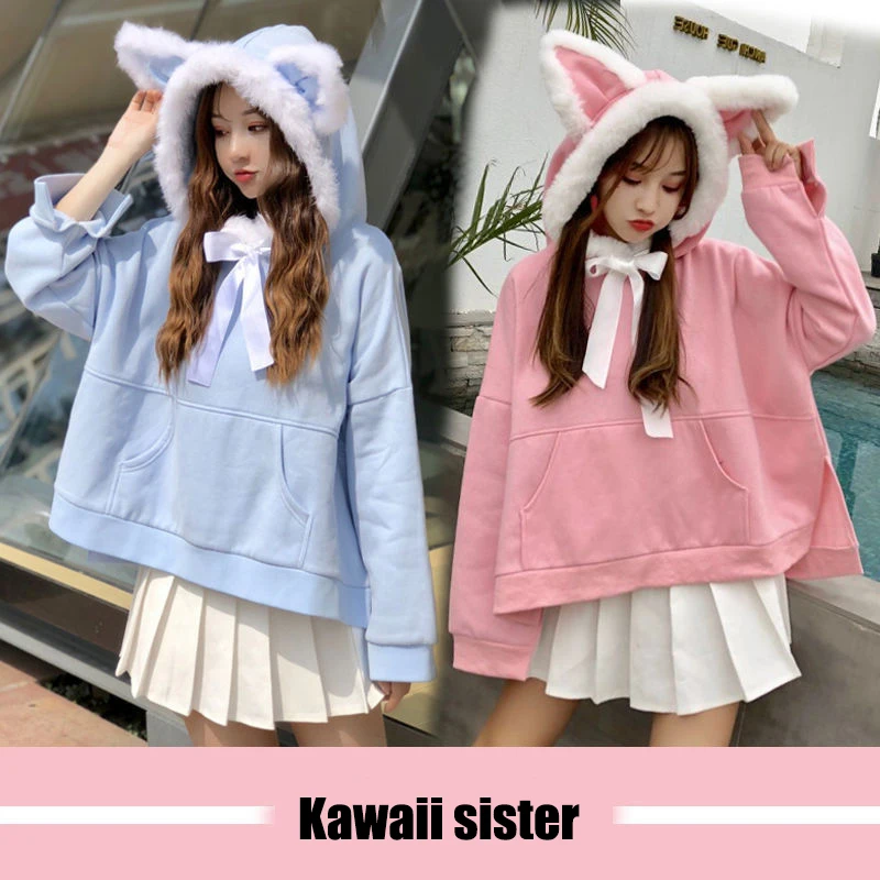 Best Wool Blend Ear Autumn Winter Women Hoodies Japanese Sweatshirt Loose Kawaii Outwear Harajuku Oversized Hoodie Streetwear Females and You will save 45% or US $21.72 today