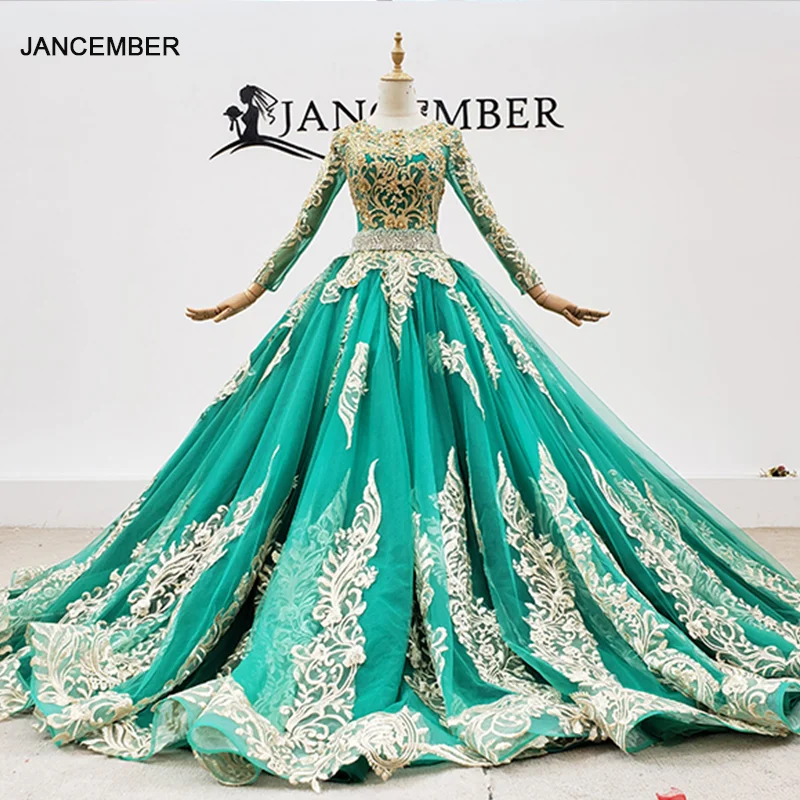 HTL1784 Golden Sequined Applique Green Custom Evening Dress For Wedding Party 2020 O-Neck Long Sleeve Crystal Ball Gowns